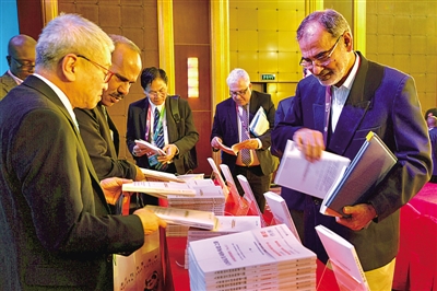 第二屆虹橋國際經濟論壇上,與會嘉賓在翻閱新書《國際減貧合作:構建人類命運共同體》和《人類命運共同體構建之路》。光明日報記者張云攝/光明圖片