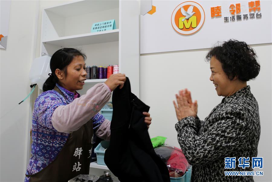 11月12日,在成都成華區二仙橋街道下澗槽社區黨群服務中心的工作間,縫紉師傅張莉(左)向前來取件的居民展示為她縫好的衣服。下澗槽社區在黨群服務中心為鎖鞋匠、縫紉師傅等提供免費場地,方便社區居民生活。 新華社記者 謝秀棟 攝