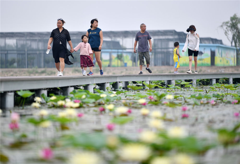 7月18日,游人在曙光水鎮(zhèn)內(nèi)漫步。(新華社記者李然攝) 趙紹軍把這片3000畝水面連成的景區(qū)取名為“圓夢湖”,也將自己的微信名改成一樣的名字。景區(qū)初具規(guī)模,京津冀周邊的游客紛至沓來。2015年,項(xiàng)目納入原國家旅游局全國優(yōu)選旅游項(xiàng)目。 圓夢湖夢圓,趙莊子村的腳步卻沒有停下。 2019年,在天津市北辰區(qū)政府的支持下,以圓夢湖為雛形的曙光水鎮(zhèn)項(xiàng)目開始規(guī)劃建設(shè)。作為實(shí)施鄉(xiāng)村振興的重點(diǎn)項(xiàng)目,規(guī)劃占地19000畝,整體分為三期,除了旅游觀光之外,加入娛樂、夜市、住宿等配套設(shè)施建設(shè),并帶動周邊其他兩村共同參與到發(fā)展中。眼下,一期項(xiàng)目已建成迎客,占地5000余畝的生態(tài)景觀因湖而建、依水造景,演藝廣場、萌寵樂園、特色島嶼更是為景區(qū)增添趣味。 “生態(tài)是我們最大的優(yōu)勢,保護(hù)好生態(tài)、發(fā)展生態(tài)游,這條路我們走對了,更要堅(jiān)持走下去,圓一個(gè)更大的鄉(xiāng)村振興夢。”趙紹軍說。 據(jù)趙紹軍介紹,如今,趙莊子村休閑農(nóng)業(yè)和鄉(xiāng)村旅游的年收入超過3000萬元,共帶動300多名村民就業(yè),農(nóng)民年均增收20%,全村年人均可支配收入達(dá)到3萬元。 “以前受累不賺錢,現(xiàn)在賺錢不受累,現(xiàn)在外面的女孩都愿意嫁過來!”在曙光水鎮(zhèn)里管護(hù)著600多只水禽的趙莊子村村民趙福來笑著說。 |