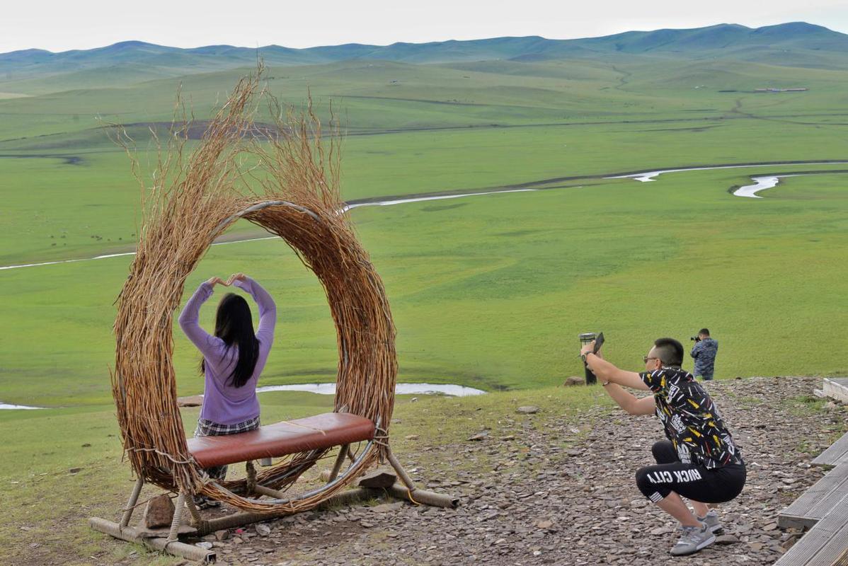 情侶旅行打卡陳巴爾虎旗牧云山頂,擺出愛心的形狀。