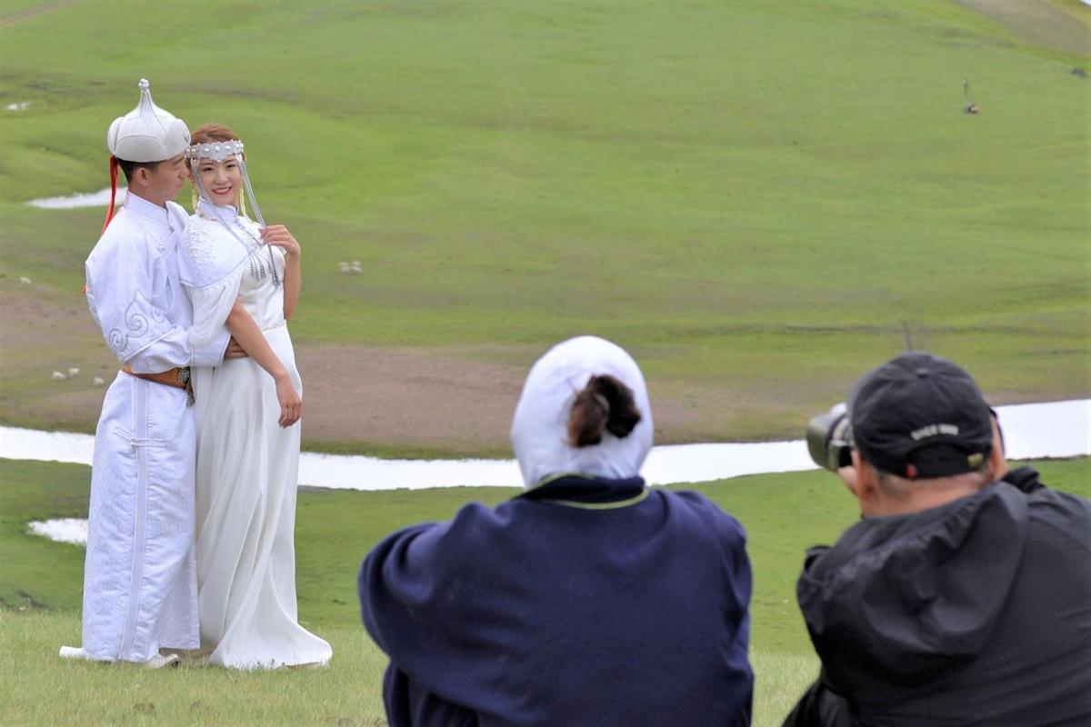 穿戴著當(dāng)?shù)胤椀囊粚?duì)新人在呼倫貝爾大草原莫日格勒河畔拍攝婚紗照。