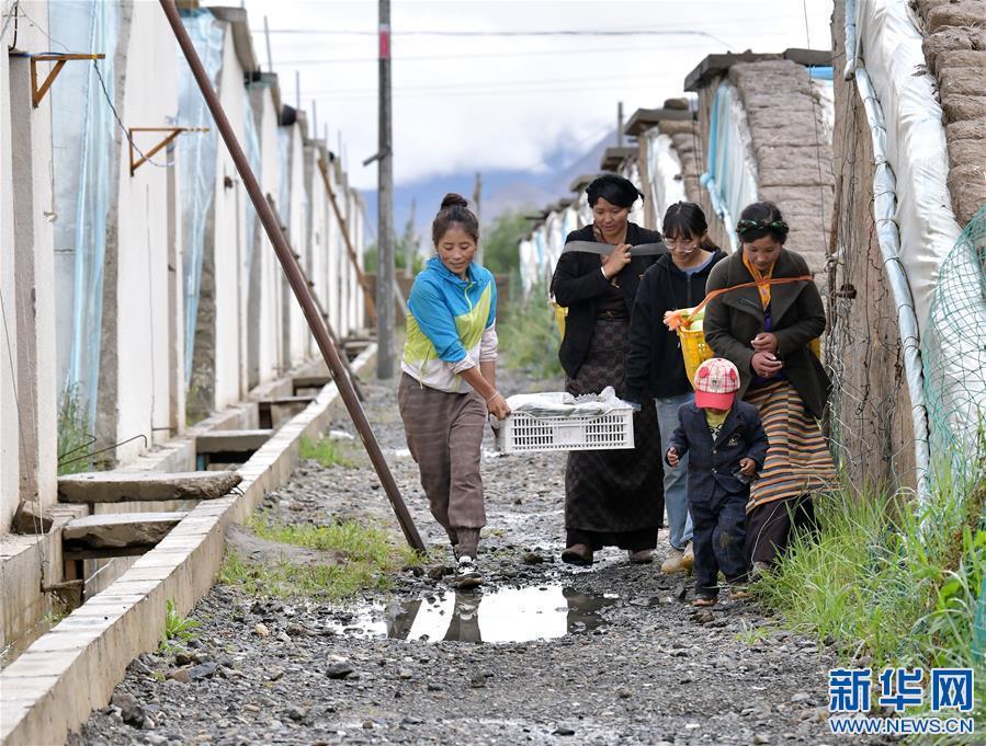 格桑旺姆(左三)和姐姐德吉卓瑪(左一)帶領雇傭的殘障村民巴珍(右一)搬運大棚出產的新鮮蔬菜。