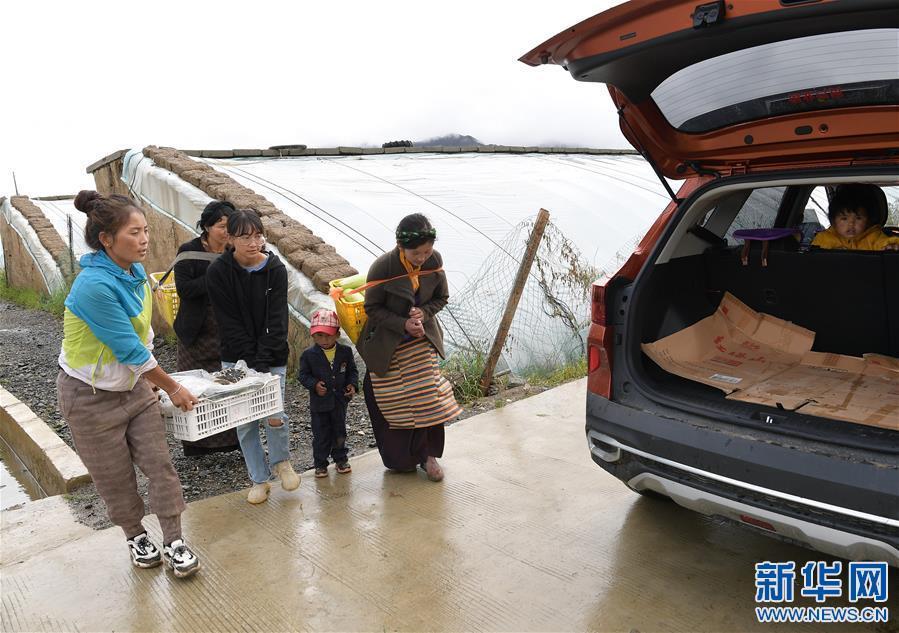 格桑旺姆(左三)和姐姐德吉卓瑪(左一)帶領工人將大棚出產的新鮮蔬菜抬上汽車,準備運往店鋪銷售。