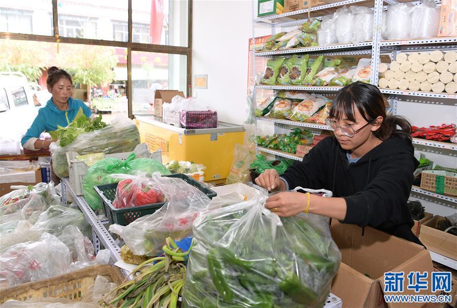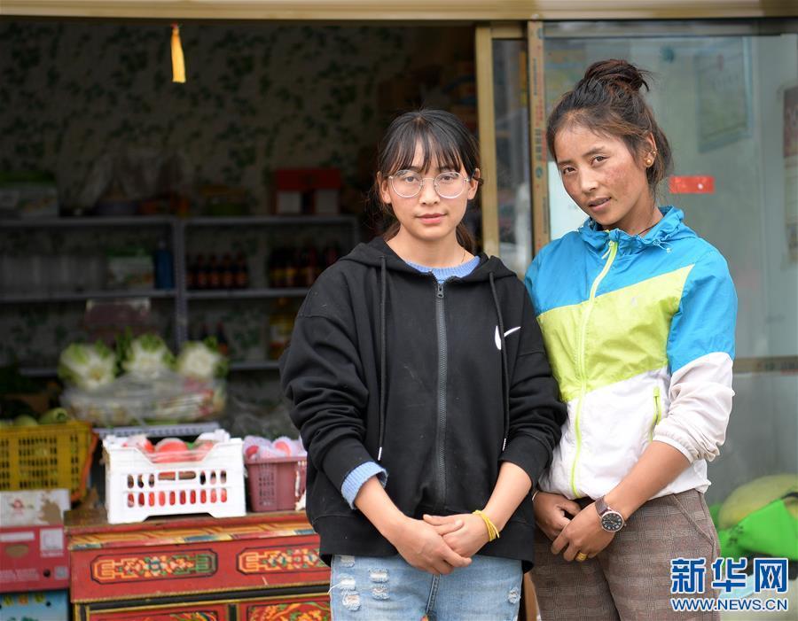 格桑旺姆(右)和姐姐德吉卓瑪在位于白朗縣的蔬菜店內忙碌。