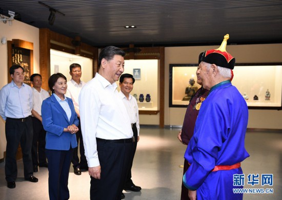 2019年7月15日,習(xí)近平總書記在赤峰博物館同古典民族史詩《格薩(斯)爾》非物質(zhì)文化遺產(chǎn)傳承人親切交談。