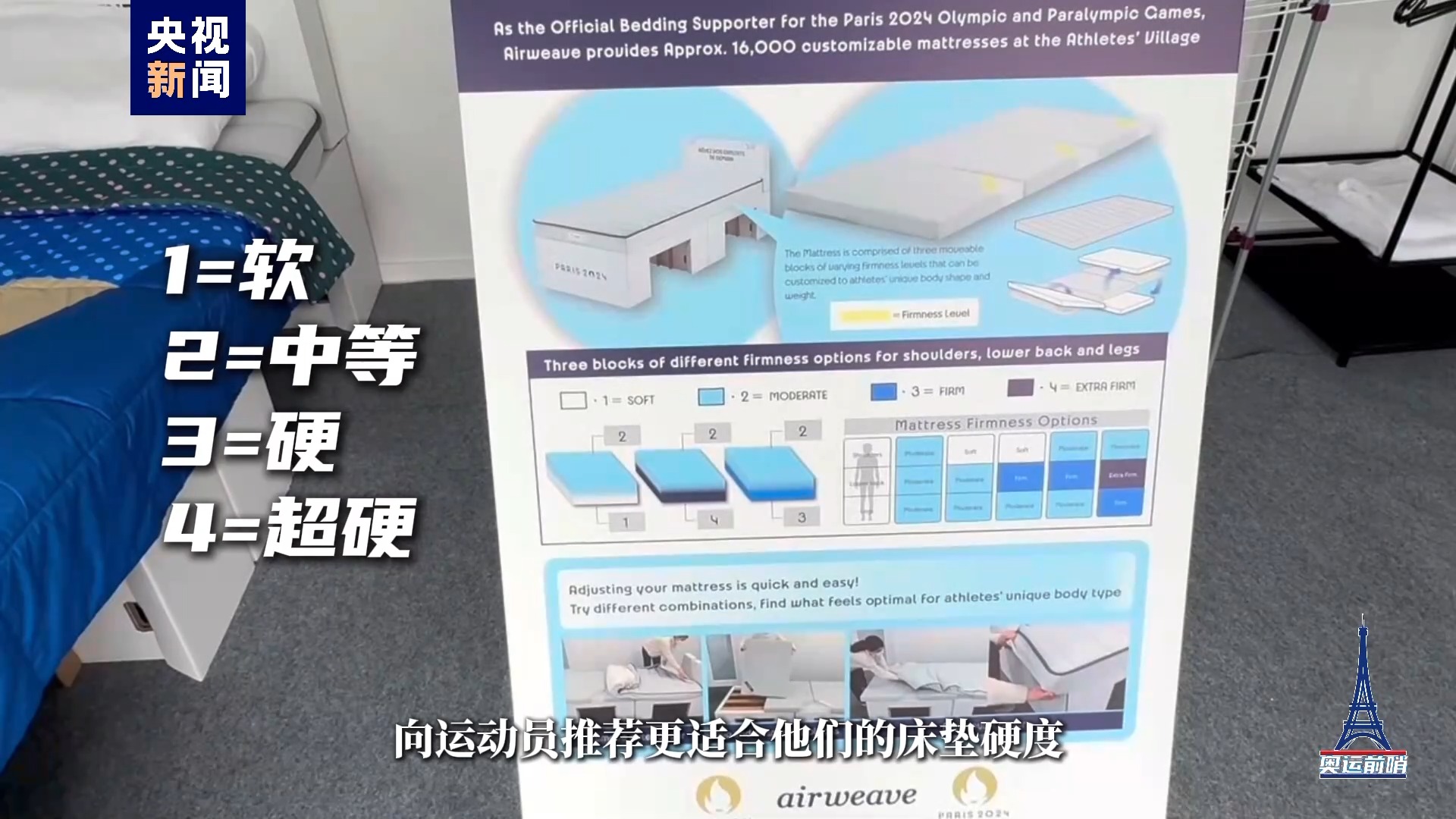 巴黎奧運(yùn)村工作人員:我們通過系統(tǒng)分析運(yùn)動(dòng)員的身體情況,向運(yùn)動(dòng)員推薦更適合他們的床墊硬度。運(yùn)動(dòng)員就可以根據(jù)了解的情況,自己改變床墊的不同硬度。我們的床墊還是可水洗的。