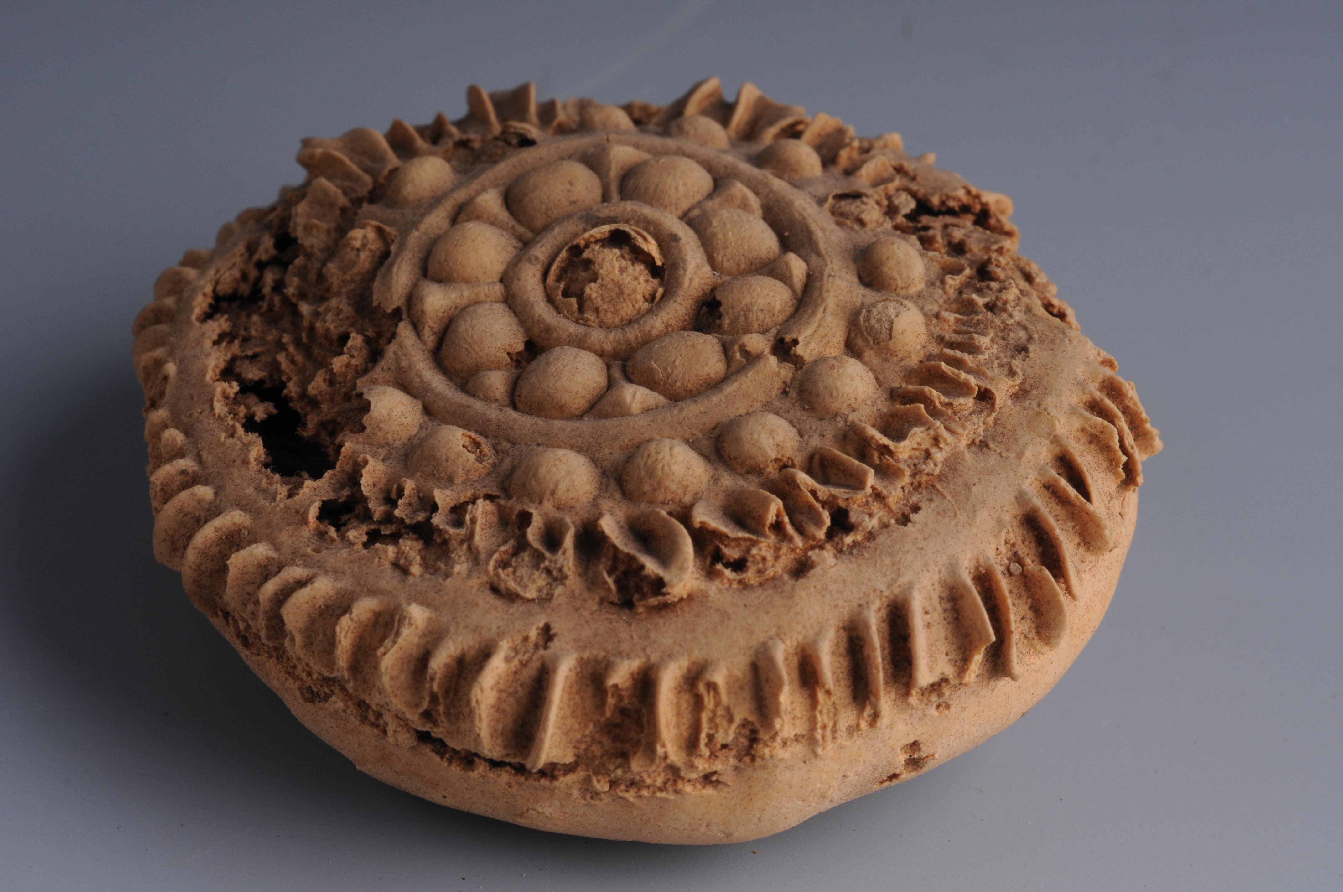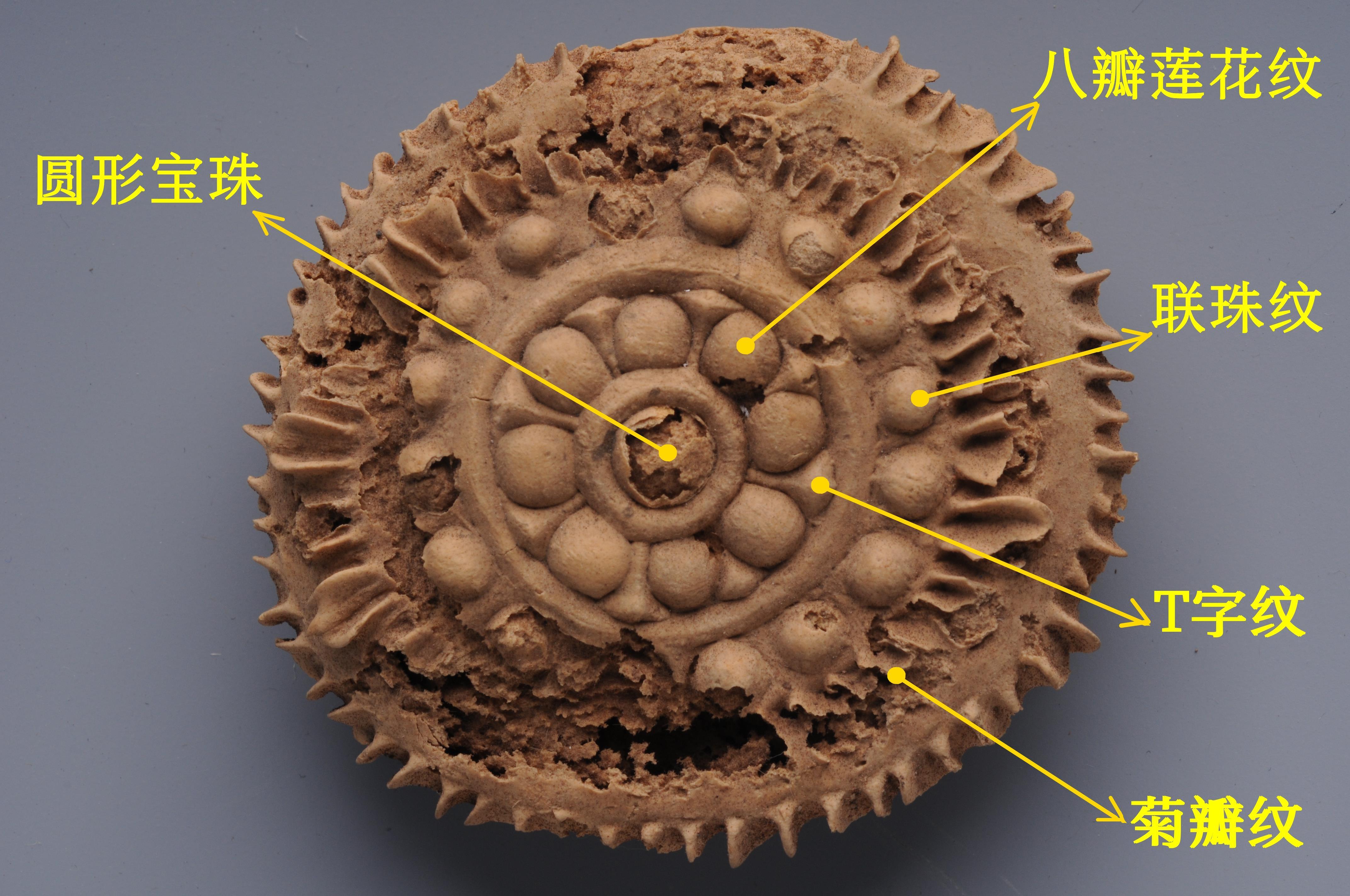 這塊寶相花月餅 出土于新疆吐魯番 是目前僅有的一件 唐代月餅式食物文物 外觀以八瓣蓮花紋為中心 每個蓮瓣間是T字紋 中間包裹住一個圓形寶珠 外圍飾有一圈聯珠紋 再往外,飾菊瓣紋