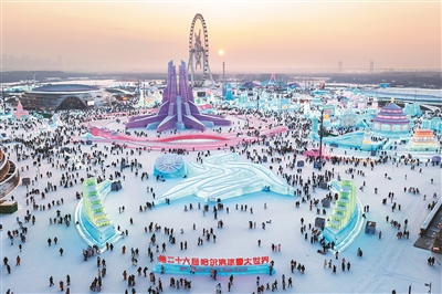 游客在哈爾濱冰雪大世界園區(qū)游玩。新華社記者 謝劍飛 攝