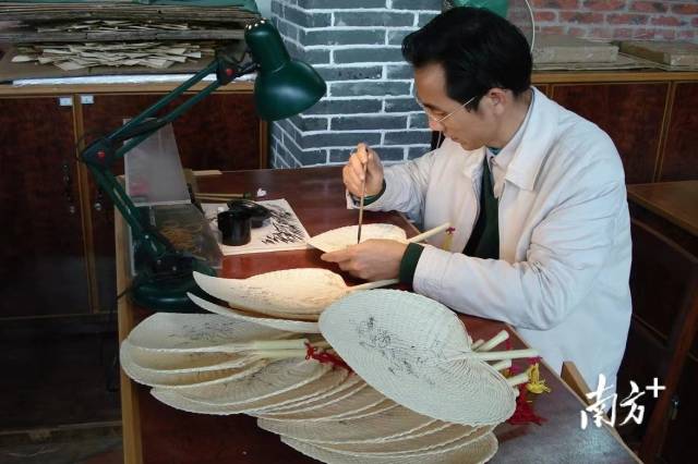 廣東省工藝美術大師、新會葵藝的國家級代表性傳承人正在制作葵藝扇。