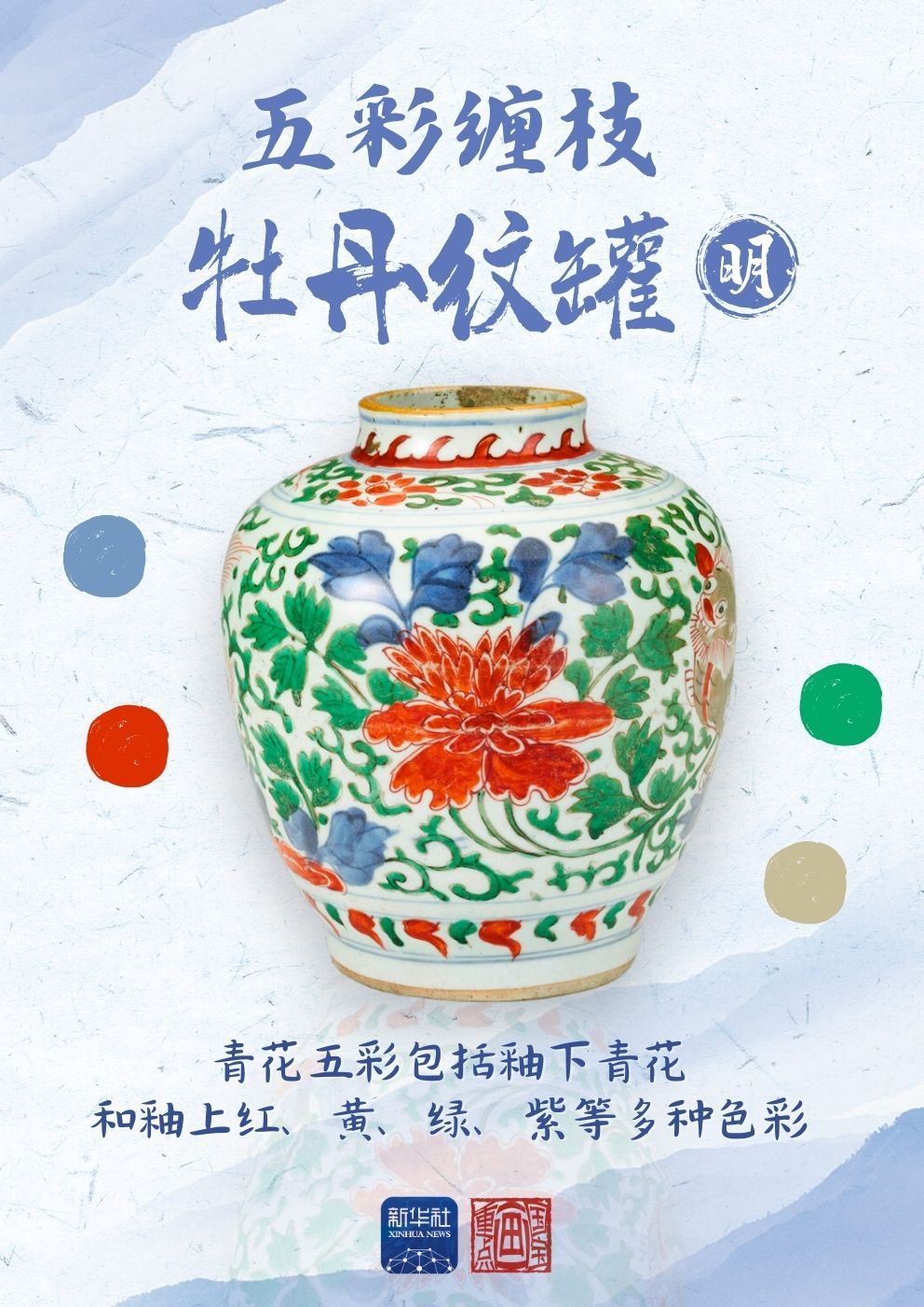 “谷雨三朝看牡丹” 牡丹花開的重要時段就是谷雨前后 牡丹花 被稱為谷雨花、富貴花 谷雨時節賞牡丹已綿延千年 牡丹花元素在我國古人社會生活中使用頻繁 五彩瓷器約在明宣德年間出現 于嘉靖、萬歷時期盛極一時 這件青花五彩瓷器色彩繽紛、紋飾生動 罐身鮮艷的色彩對比盡顯牡丹花的雍容華貴 是明清時期瓷器燒制的精品之作