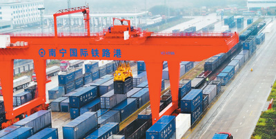 廣西南寧國際鐵路港是中國鐵路出口越南集散中心,也是中國西部陸海新通道的重要節點。圖為南寧國際鐵路港一片繁忙景象。