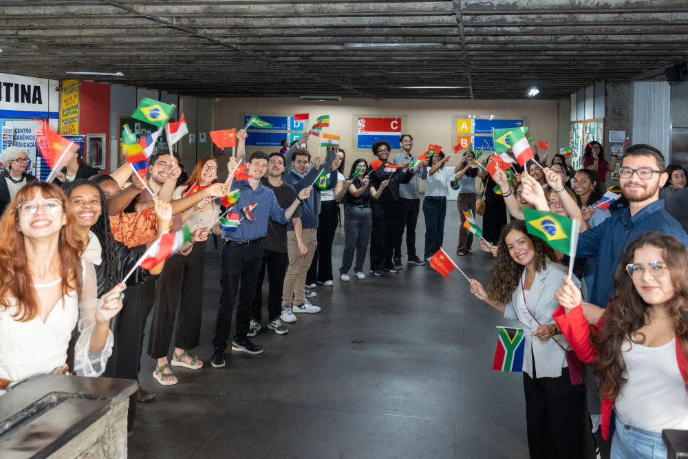 6月27日,巴西里約熱內盧州立大學的學生歡迎文明對話系列活動參會嘉賓到來。新華社記者王天聰攝