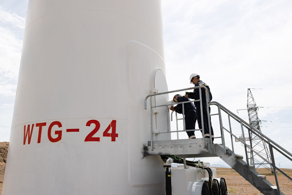 2024年6月25日,在哈薩克斯坦阿拉木圖州謝列克風電場,工作人員準備打開風機塔筒門進行檢查。新華社記者白雪騏攝