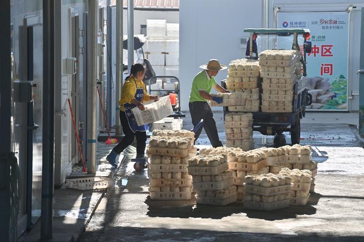 2024年10月31日,村民在廣西百色市德保縣那造村食用菌生產基地搬運采摘的蘑菇。那造村通過做優特色產業、豐富村民生活、完善基礎設施等多項具體舉措,推動各項事業快速發展。