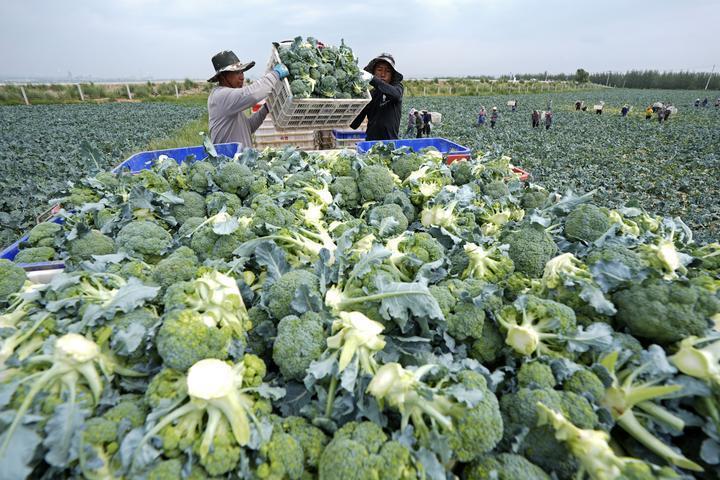 2025年7月18日,工作人員在寧夏固原市原州區彭堡鎮萬畝冷涼蔬菜基地運輸西蘭花。固原依托高海拔、氣候冷涼等“冷資源”優勢,大力發展冷涼蔬菜產業,著力打造“六盤山冷涼蔬菜”區域公用品牌。目前已建成冷涼蔬菜規模化種植基地130余個,種植面積穩定在50萬畝,年產鮮菜200萬噸以上。“六盤山冷涼蔬菜”這張打造的“綠色名片”,已成為當地鄉村振興發展之路上的“熱產業”。