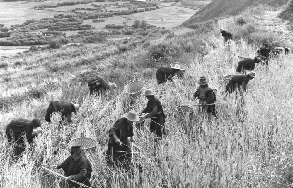 1965年,堆龍德慶縣(現(xiàn)為堆龍德慶區(qū))南崗鄉(xiāng)互助組組員們?cè)谑崭钋f稼。新華社記者 吳祖政 攝