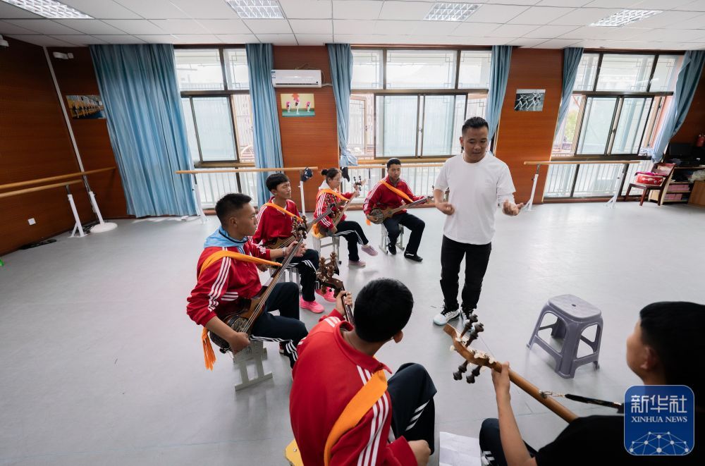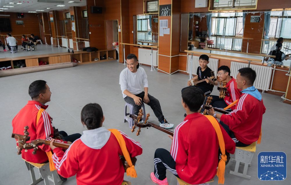↑ 9月9日,在拉薩市第二中等職業技術學校,洛桑次仁老師在給孩子們傳授扎念琴彈奏的要領。