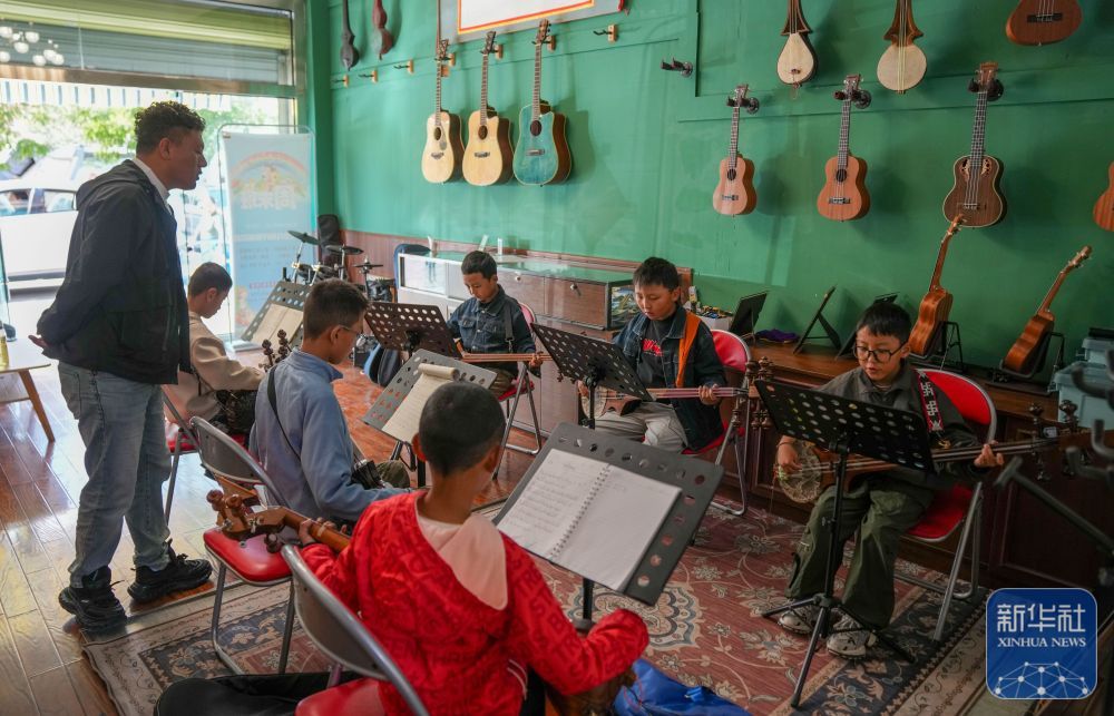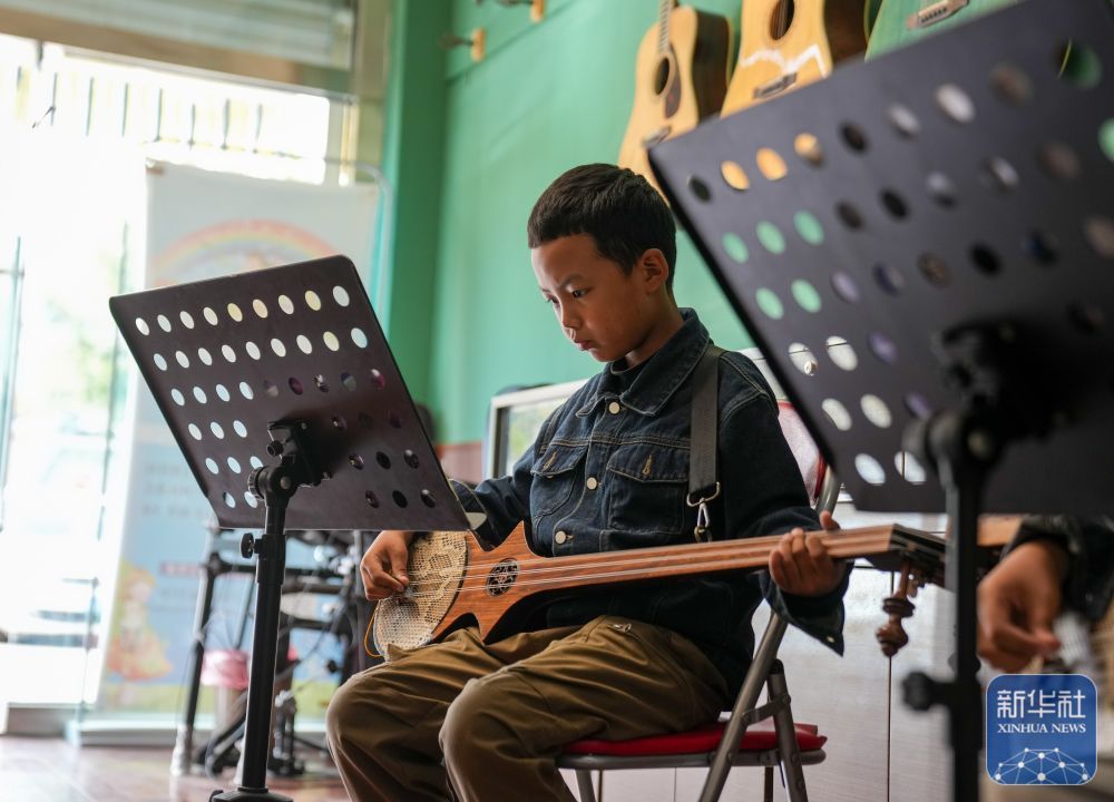 ↑ 9月13日,在拉薩市古樂扎念琴行,孩子們在彈奏扎念琴。
