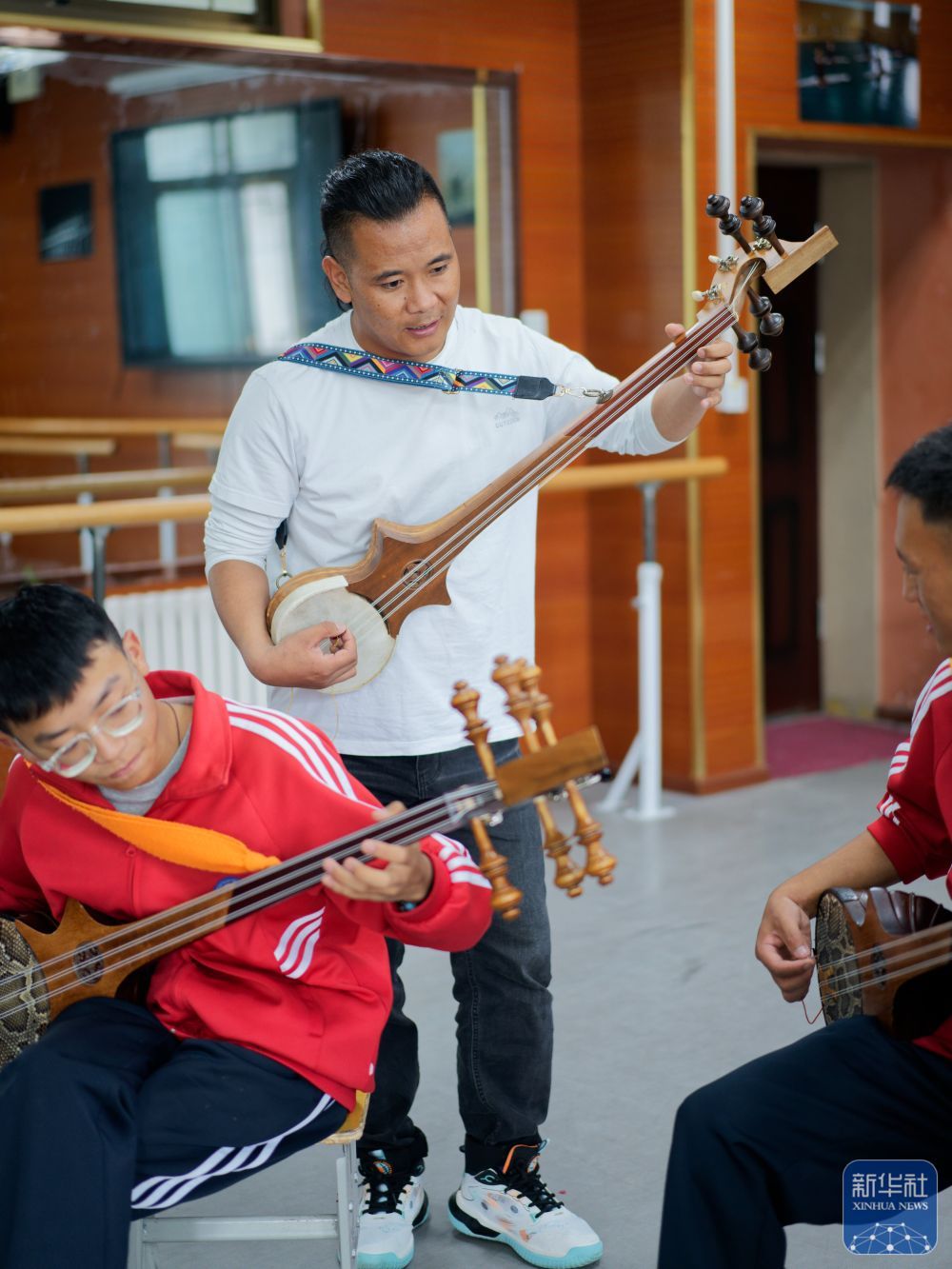 ↑ 9月9日,在拉薩市第二中等職業技術學校,洛桑次仁老師在糾正孩子們彈奏扎念琴的動作。
