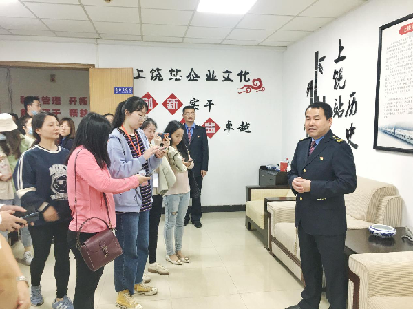 上饒站黨總支書記陳衛紅向記者介紹火車站。圖片來源:中國鐵路南昌局集團有限公司 陳衛紅說,“2014年第五代高鐵站房啟用后,上饒正式邁入了高鐵時代。從上饒坐高鐵到上海只要2小時50分鐘,時速350公里,這種速度剛參加工作的時候我想都不敢想?!?/p> 如今,上饒火車站已成為上饒市熱門網紅打卡地,車站外形象一艘揚帆起航的船,站內的設備設施也更加完善,和諧號動車已經在車站???,許多市民都相約到車站或一睹動車風采或興奮地乘坐動車出行。