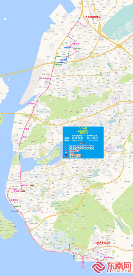 D100路通勤快線公交線路圖(廈門運(yùn)輸中心供圖) 東南網(wǎng)11月5日訊(本網(wǎng)記者 劉瑋 通訊員 李凌云)記者今日從廈門公交集團(tuán)有限公司了解到,為提升市民通勤效率,緩解早晚高峰時段的交通壓力,公司特別推出了D100路通勤快線,該線路連接高崎公交場站與廈大學(xué)生公寓,采用“定時定點(diǎn)+減站提速”的運(yùn)行模式,旨在為市民提供更快捷、更舒適的跨區(qū)出行選擇。 D100路通勤快線在早晚高峰期間運(yùn)行,通過減少停靠站點(diǎn),提高線路運(yùn)行效率。該線路保留了寨上片區(qū)、湖里老城區(qū)、思北路口、廈大學(xué)生公寓等客流集中區(qū)域,同時調(diào)整路線避開擁堵路段,預(yù)計可節(jié)約15-20分鐘的運(yùn)行時間。此外,D100路還增停了開禾路口、輪渡碼頭、海濱大廈(往高崎方向)、和平碼頭(往學(xué)生公寓方向)等大客流站點(diǎn),以滿足沿線乘客的出行需求。 D100路是基于22路公交線路的優(yōu)化升級,相較于22路的37個站點(diǎn),D100路僅設(shè)有18個站點(diǎn),顯著減少了停靠次數(shù)。22路公交線路每日運(yùn)行,而D100路則僅在工作日運(yùn)行,高崎公交場站和廈大學(xué)生公寓的首末班車時間分別為7:00-8:00和17:00-18:00。 在早高峰時段,22路往廈大方向的運(yùn)行時間約為95分鐘,而D100路可減少25分鐘;晚高峰時段,22路往廈大方向的運(yùn)行時間約為91分鐘,D100路可減少17分鐘。這一改變將大大提升沿線乘客往返湖里區(qū)自貿(mào)區(qū)象嶼片區(qū)、思北開禾路口周邊寫字樓及軟件園一期的通勤效率。 D100路的票價為一票制5元,但在試運(yùn)行期間,票價為2元。市民可以通過廈門公交APP查看線路詳情,以更好地規(guī)劃自己的通勤路線。 廈門公交集團(tuán)有限公司致力于打造國內(nèi)領(lǐng)先的城市公共交通出行服務(wù)商,通過不斷探索和創(chuàng)新,為市民提供更加便捷、高效的出行選擇。D100路通勤快線的推出,是公司在構(gòu)建“公交+”多元化公共交通體系方面邁出的重要一步。 |