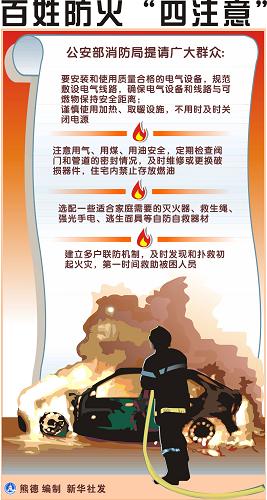 百姓防火“四注意” 新華社發(fā) ——要嚴格按照有關(guān)法律法規(guī)和技術(shù)標準的規(guī)定,安裝和使用質(zhì)量合格的電氣設(shè)備,規(guī)范敷設(shè)電氣線路,確保電氣設(shè)備和線路與可燃物保持安全距離;謹慎使用加熱、取暖設(shè)施,不用時及時關(guān)閉電源。 ——注意用氣、用煤、用油安全,定期檢查閥門和管道的密封情況,及時維修或更換破損器件,住宅內(nèi)禁止存放燃油。 ——選配一些適合家庭需要的滅火器、救生繩、強光手電、逃生面具等自防自救器材,及時撲救初起火災(zāi),安全逃離火災(zāi)現(xiàn)場。 ——建立多戶聯(lián)防機制,加強對未成年人、老年人和病殘人員等群體的安全監(jiān)護,開展防火檢查尤其是夜間防火巡查,及時發(fā)現(xiàn)和撲救初起火災(zāi),第一時間救助被困人員。 延伸閱讀:廈門:電氣火災(zāi)成“禍首”占總數(shù)的54% (張景勇,崔清新) ? |