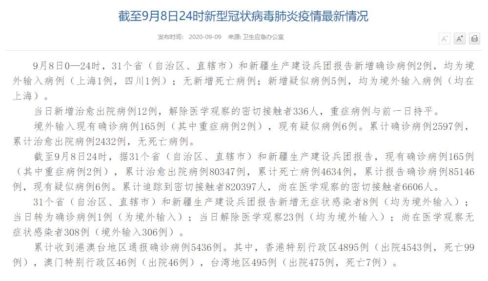 人民網北京9月9日電(董童)國家衛生健康委于今日在官網發布的《截至9月8日24時新型冠狀病毒肺炎疫情最新情況》(以下簡稱“情況”)提出,9月8日0—24時,31個省(自治區、直轄市)和新疆生產建設兵團報告新增確診病例2例,均為境外輸入病例(上海1例,四川1例);無新增死亡病例;新增疑似病例5例,均為境外輸入病例(均在上海)。當日新增治愈出院病例12例,解除醫學觀察的密切接觸者336人,重癥病例與前一日持平。