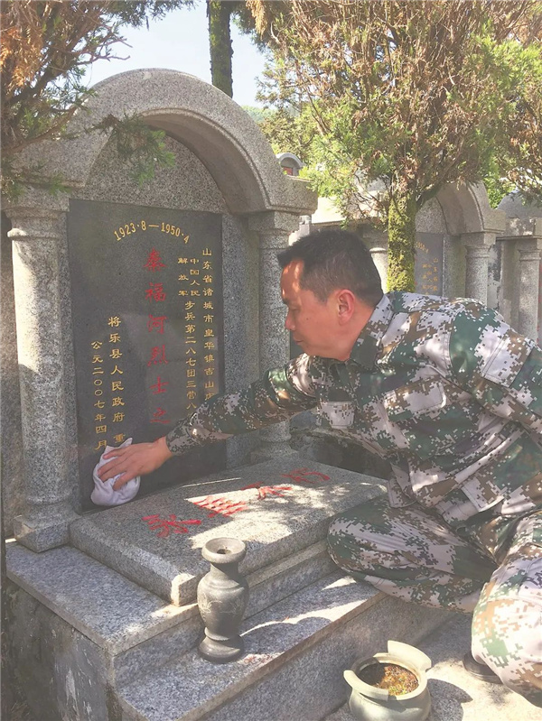 又是一年清明時,將樂縣天閣陵園秦福河烈士墓前,湯順榮俯下身子,用干凈的毛巾小心翼翼地抹去墓碑的灰塵,讓秦福河烈士名字更加熠熠生輝。這是湯家人連續第72年為親如家人的秦福河烈士祭掃。 湯順榮是將樂縣水南鎮渡頭村村民。1950年,湯順榮的爺爺湯七根、父親湯萬叢將山東籍解放軍戰士秦福河的遺體從金溪河撈起安葬,從那以后,每年清明都會去祭掃。湯七根年齡大了,走不動了,就把祭掃烈士墓的任務交到了湯順榮的父親湯萬叢手中。1998年,湯順榮從部隊退伍回鄉后,又從父親手中接過重任。湯家三代人光榮接力,72年一直守護。