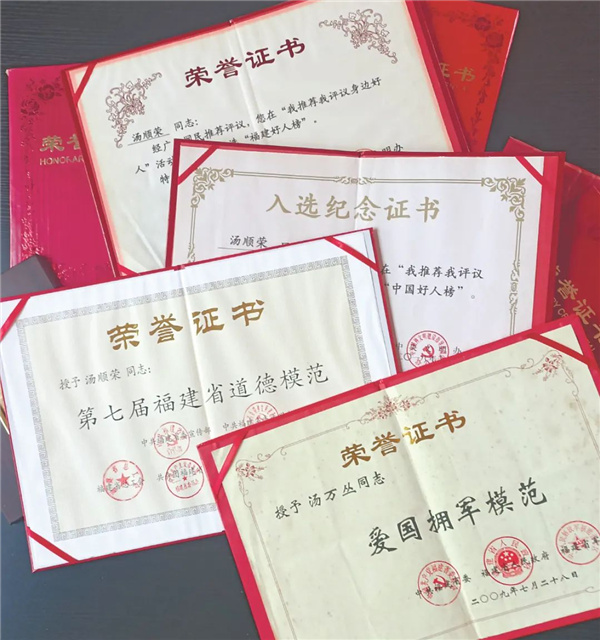 △湯萬叢、湯順榮父子倆榮獲的部分榮譽證書 一句承諾 穿過古色的涵洞,踏著青石條板,可領略到水南渡口舊日的忙碌與繁盛,金溪河波光粼粼,無聲地流向遠方。“就是在這里,當年秦福河烈士被我父親抬上來。”站在渡口邊上的湯順榮指著金溪河上游不遠處的水面說。 時間追溯到1950年初,剛解放不久的將樂縣周邊,國民黨殘兵敗將與地方土匪武裝狼狽為奸,為非作歹,經常攪得四鄰八鄉雞犬不寧。 當時,年僅14歲的湯萬叢跟隨其父湯七根在水南渡口擺渡謀生。4月的一天上午,因連降暴雨,金溪河水暴漲。湯萬叢獨自在水南渡口替父親照看竹排。突然,他發現河上游漂來一個不明“物體”,連忙舉起搭鉤朝那物體探去。靠近一看,大吃一驚,原來是一具身著淺黃色軍裝的遺體,再細看,鋼盔內的軍帽上綴著一顆紅色五角星。啊!原來是解放軍叔叔! 想起不久前,自己撐竹排送過一批又一批解放將樂、過河進城的解放軍,他們個個英姿勃發,態度親切和藹,對老百姓像對待自己的親人一樣。想到這里,湯萬叢不再害怕,他縱身跳入河中,使出渾身力氣將遺體朝岸邊推去,拉到岸邊樹林中隱藏起來,然后跑去找父親。 湯七根正在河對岸的縣城買豬肉,聞訊匆忙趕到河岸邊。父子倆在遺體的軍衣口袋里發現了一個小記事本,上面寫著:秦福河,25歲,山東省五蓮縣人,中國人民解放軍步兵第二八七團三營八連戰士。湯七根對兒子說:“解放軍就是當年打土豪、分田地的紅軍,我見過,個個都是好人。這位解放軍戰士大老遠從山東來,幫咱們打土匪,讓我們過上太平日子。如今,他英勇犧牲,我們就是他的親人,要找個地方讓他入土為安。” 就這樣,湯七根拿出為自己準備的棺木,冒著被土匪報復的危險,秘密把這位素不相識的解放軍戰士秦福河安葬在金溪河畔自家的菜地里。 轉眼過了中秋,閩贛粵三省交界進行大規模剿匪,土匪被解放軍一網打盡。想到烈士匆匆下葬,一家人滿懷歉意。于是,湯七根湊足錢,從縣城請來石匠,選用本地最好的“龍池硯石”打制墓碑,把從烈士小記事本上抄下來的內容全都刻在墓碑上,并在墓碑的正上方刻上一顆紅五角星,按照當地風俗重新給烈士修墳立碑安葬。 1958年春,湯七根臨終前特意叮囑兒子湯萬叢把自己埋到烈士身邊,別讓烈士孤單了。遵從湯七根的囑咐,湯萬叢把父親葬在了烈士墓旁,年年不忘祭祀。 為烈士尋親 改革開放后,百姓富起來了。每年清明,湯萬叢祭祀秦福河烈士的供品也多了起來,有豬肉、烤鴨、河魚、水果和自家釀的米酒。他常跟子女說:“烈士是為我們打土匪犧牲的,我們今天的好日子是他們用生命換來的。他犧牲在我們這里,就是我們的親人,理所當然要盡親人的情分和義務。” 后來,村里有人在秦福河烈士墓附近蓋房子,建豬圈,一到下雨天,污水便流入秦福河烈士的墓地。湯萬叢見了心疼,寢食難安。為解決這樁心事,1990年12月12日,他決定為烈士遷墳。將樂縣民政部門得知此事,被他的真情所感動,便從安置優撫金中劃出300元,支持這一義舉。 很快,湯萬叢在水南的龍燈山選好一塊地,帶領全家人重新為烈士修墳立碑安葬。 修好烈士新墳當天,湯萬叢要湯順榮記住:“我們一家永遠都是秦福河烈士的親人,今后不管再苦再難,你們也要像我和你們的爺爺一樣,守護好烈士墓。” 2007年,縣里倡導殯葬改革,在將樂縣民政部門的支持下,秦福河烈士墓被遷到天閣陵園革命烈士墓區。革命烈士墓區雖然有專人管護,但湯萬叢父子倆年年清明節依然前往祭掃秦福河烈士墓。 湯萬叢義葬英烈、長年堅持祭掃烈士墓的感人故事在將樂大地傳開后,成為佳話。2009年7月,湯萬叢被福建省委、省政府、省軍區授予“愛國擁軍模范”榮譽稱號。 為秦福河烈士尋親,一直是湯萬叢的心愿。將樂縣民政部門得知湯萬叢心事后,多次幫助函查,終于查到秦福河烈士有一個親生女兒叫秦洪花居住在天津。聽到這一消息后,湯家人激動不已。 2007年9月28日,秦福河烈士的女兒秦洪花專程從天津來到將樂,祭拜父親,看望和感謝湯萬叢一家人。那天,當秦洪花和她兒子陳波見到湯萬叢時,感動地說:“我們就當您是親舅舅、親舅公了。舅舅、舅公!57年了,這一刻終于盼來了……”母子倆淚如雨下,湯萬叢也老淚縱橫。隨后,兩地親人手捧鮮花,齊刷刷地跪在秦福河烈士墓前祭拜,告慰烈士在天之靈。 當秦洪花含淚告別時,湯萬叢再三安慰她說:“老妹,你住在天津,來往一趟很不容易,我們現在就是一家人,祭掃的事就交到我手上,你就放一百個心吧,我們會世世代代傳承下去的!” 傳承之美 “父親在世時反復對我說,要守好烈士墓,我們的好日子,都是無數革命先烈用生命換來的。長大后,我就越來越明白這個道理,不僅要去做好這件事,還要讓子孫后代也傳承下去,因為我們不能忘記歷史,幸福真的來之不易。” 受秦福河烈士和家人的影響,湯順榮于1995年入伍,圓了自己當一名軍人的夢想。1998年,湯順榮從部隊退伍還鄉,接過年邁父親手中的“接力棒”,繼續守護好秦福河烈士墓,不僅清明節必去祭掃,每逢“八一”建軍節也要去為烈士獻花,清掃落葉、拂去灰塵,為烈士墓碑描紅。 想到秦福河等無數先烈為人民英勇獻身,以及祖輩、父輩的教誨,這些寶貴的精神財富、無形的力量,化為湯順榮為人處世的基礎和干事創業的動力。 2012年,湯順榮開始自籌資金創業,創辦了一家水泥制品小作坊,主要