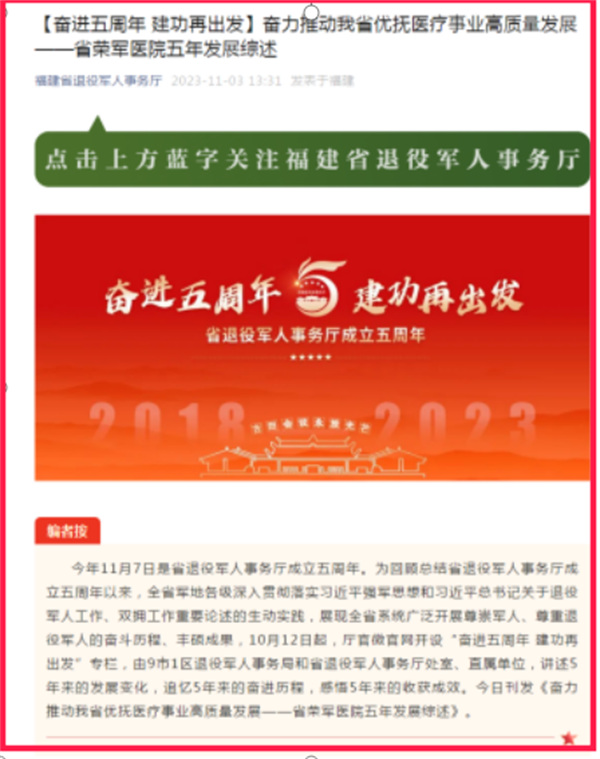 廳業務處室、直屬單位和9市1區退役軍人事務局各采寫一篇綜述文章陸續在東南網和廳官微官網刊發,通過回顧各地各部門5年來的“經驗”“樣板”“答卷”“模式”等,交流推動全省退役軍人事務工作不斷破局啟新的好做法、好經驗,激勵全省退役軍人事務系統在新時代以“滿弓”的狀態踔厲奮發、再啟新篇。 編印一本五周年畫冊