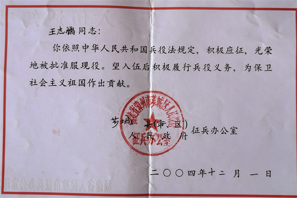 王志鵬個人入伍通知書 曾經(jīng),他們都是軍人。如今,他們一起兄弟擔(dān)當(dāng)有所成就。一路走來,他們始終保持建功立業(yè)的奮進(jìn),更從未忘記回饋社會的擔(dān)當(dāng)。 王少煌,1999年12月入伍于河北空軍某部,2002年12月退伍;王志鵬,2004年12月入伍于福建省軍區(qū)原海防某團(tuán),2009年12月退伍。兄弟倆在部隊期間均獲得不錯佳績,得到優(yōu)秀士兵、優(yōu)秀士官等榮譽(yù),并入了黨。