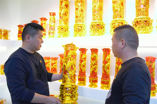 王志鵬(左)兄弟正在查看研發(fā)的新產(chǎn)品 “今年是龍年,我特意開發(fā)了新產(chǎn)品,現(xiàn)在十分暢銷。”看著自己的研究成果,王志鵬顯得十分高興。他說,環(huán)境一直在變,我必須要有創(chuàng)新思維,否則難以在市場上立足。為了研制新產(chǎn)品,他自學(xué)工板、自己創(chuàng)作、親自試驗。王志鵬回憶起來,仍然記得在部隊當(dāng)班長時說過的話,做什么事都要以身作則,只有自己沖在最前面才能帶領(lǐng)更多的人沖鋒。 談及企業(yè)發(fā)展面臨的壓力,王志鵬直言,壓力常伴企業(yè)左右。“人無遠(yuǎn)慮,必有近憂”,并認(rèn)為“化解壓力一定要打好‘提前量’,就不會有措手不及的事情,就能度過各種危機(jī)。” 疫情期間,是企業(yè)經(jīng)營最困難的時候。最少時公司只有1-2名工人,但兄弟倆仍堅持誠信經(jīng)營的標(biāo)準(zhǔn),答應(yīng)的貨總是想方設(shè)法、加班加點(diǎn)送到。如今,王志鵬兄弟創(chuàng)辦的常光鴻運(yùn)工貿(mào)有限公司高峰時期員工有近百人,全部是附近村莊留守中老年人。