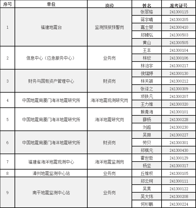 注:以上人員按照每個崗位的準考證號碼排序 三、注意事項 1.面試確認 請進入面試的考生于2024年5月24日17:30登錄報名系統(211.71.235.164) 確認是否參加面試,并按照要求準備資格復審材料;如確定放棄面試資格,請填寫“XXX放棄福建省地震局XXXXX崗位面試資格聲明”,內容見附件1,于2024年5月24日17:30前發送電子郵件至rjc@fjea.gov.cn,發送郵件后請電話聯系確認。逾期未在系統確認的,視為自動放棄面試資格。 2. 資格復審 請確認參加面試考生于2024年5月24日17:30前將以下相關材料掃描件打包發送至rjc@fjea.gov.cn,文件名以“XXXXX崗位+考生姓名+資格審查材料”命名,發送后請電話聯系確認: (1)《福建省地震局應聘人員報名表》(附件2)1份。 (2)二代身份證原件1份。 (3)崗位要求的學歷和學位證書原件1份(取得境外學歷學位的應提交教育部留學服務中心學歷學位認證書原件1份);2024屆畢業生暫時無法提供相關證件的,應書面保證學歷學位等材料真實、有效。 (4)已參加工作的,需提交現工作單位人事主管部門出具的同意報考的證明(或與單位解除勞動、聘用合同關系的證明)。若暫時無法提交的,本人應做出書面承諾,經我局同意,最遲可延至考生接到考察通知之日提交,否則,取消考察資格。 考生應對所提供材料的真實性負責,材料不全或主要信息不實,或與報名材料不符者,影響資格審查結果的,將取消面試資格。面試前還將進行現場資格復審,請考生備齊以上材料原件及復印件1份,于面試當天帶到候考室復審。 聯系人:姚黎 聯系電話: 0591-87852739 0591-87816753 福建省地震局人事教育處 2024年5月20日 |
